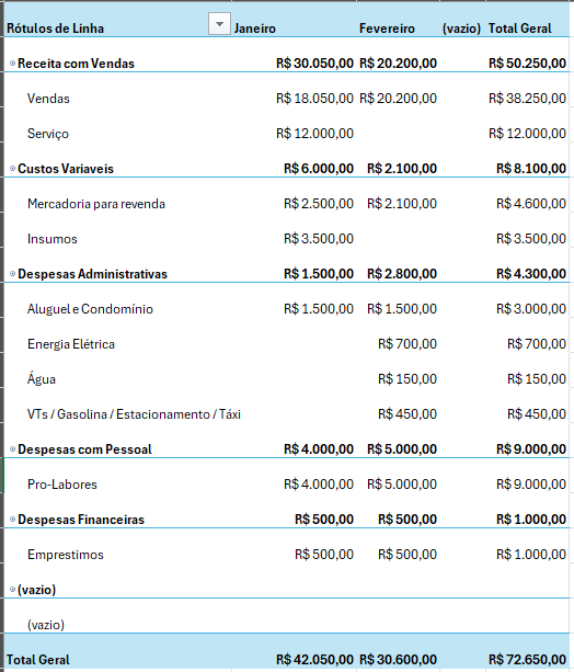 TABELA DINAMICA COM DETALHAMENTO DE TODAS ENTRADAS E SAÍDAS DE DINHEIRO